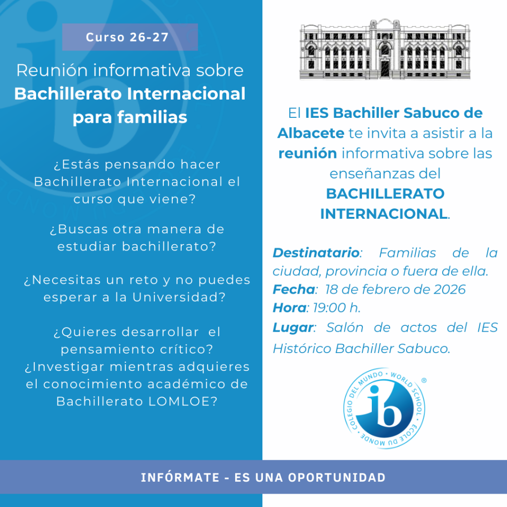 El miércoles, 18 de febrero de 2026, a las 19:00 h, en el Salón de actos se celebrará una reunión informativa, destinada a familias, sobre el Bachillerato Internacional y sus posibilidades. Asistirán profesores y estudiantes del centro para explicar su funcionamiento y experiencia.