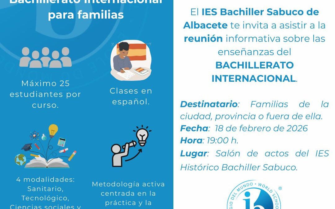 El miércoles, 18 de febrero de 2026, a las 19:00 h, en el Salón de actos se celebrará una reunión informativa, destinada a familias, sobre el Bachillerato Internacional y sus posibilidades. Asistirán profesores y estudiantes del centro para explicar su funcionamiento y experiencia.