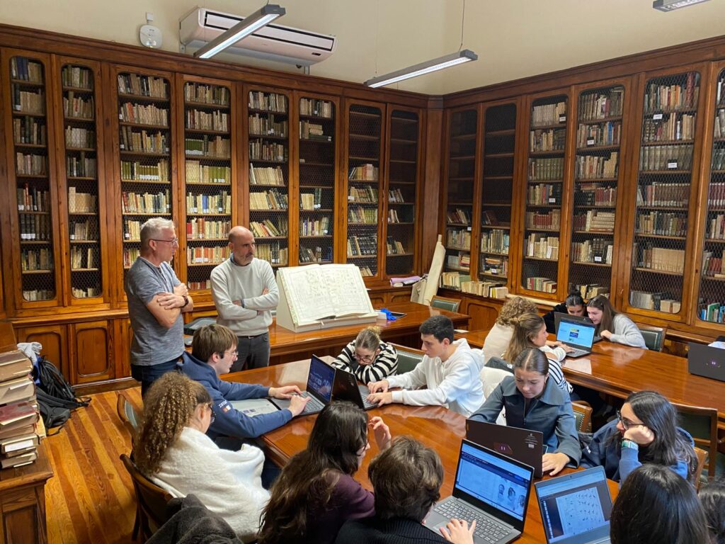Foto trabajo colaborativo Taller de divulgación del Patrimonio histórico de nuestro Instituto. Los alumnos franco-españoles han tenido la ocasión de valorar y utilizar nuestros fondos , demostrando la trayectoria y la vigencia del proyecto europeo.